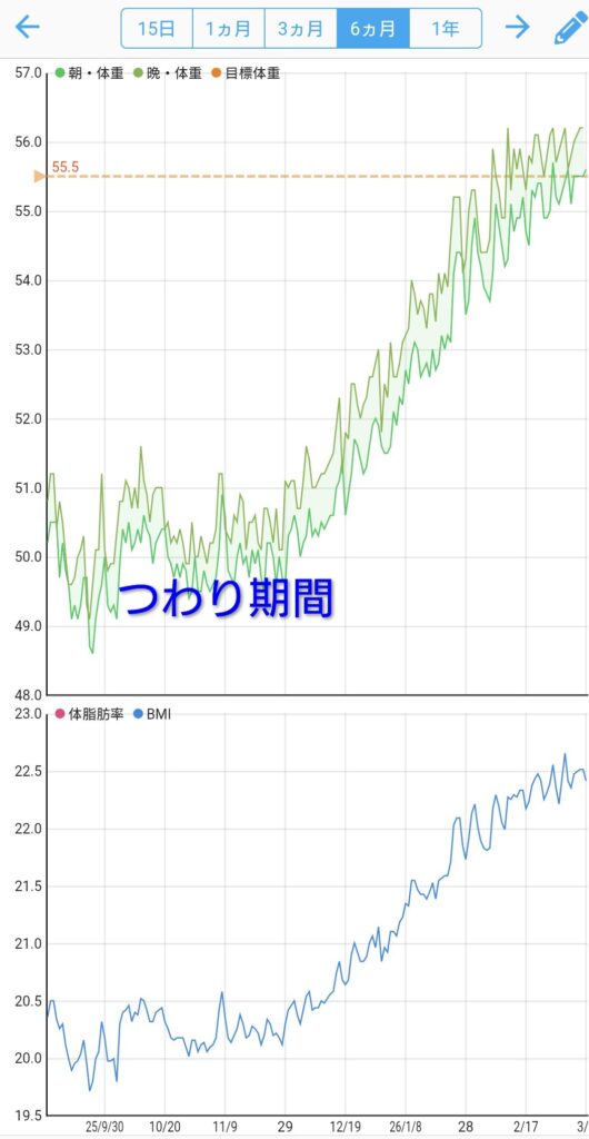 私は妊娠前から毎日体重を記録しているので、体重の推移をグラフで振り返ることができます。