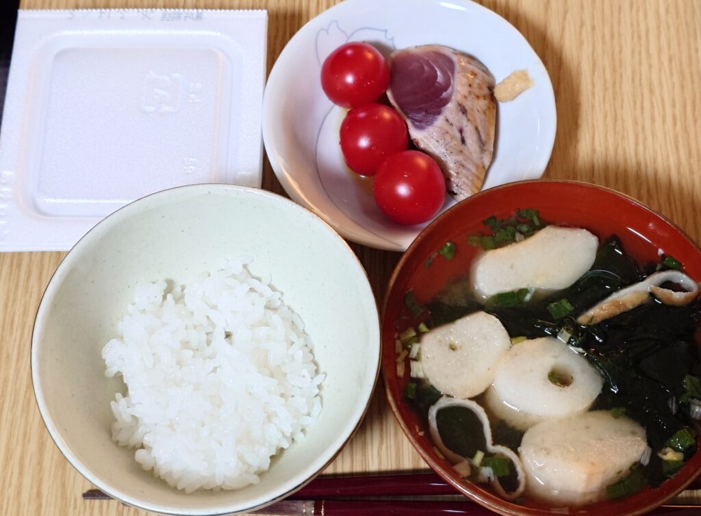 ごはん(少量)、わかめとお麩の味噌汁、かつおのたたき一切れ、ミニトマト×3、納豆