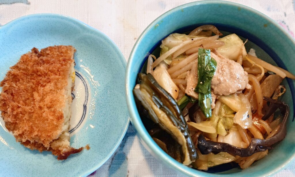 セブンイレブン 鉄鍋炒めの野菜炒め丼(1/3量)、野菜コロッケ(半分)