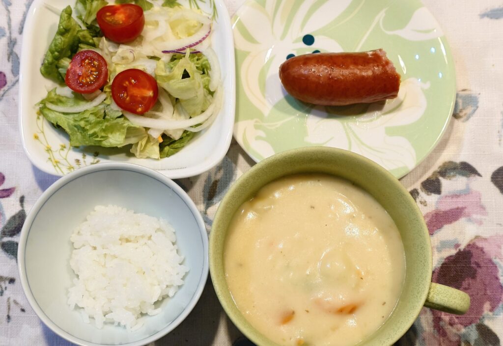 シチュー、フランクフルト(半分)、サラダ🥗、ご飯